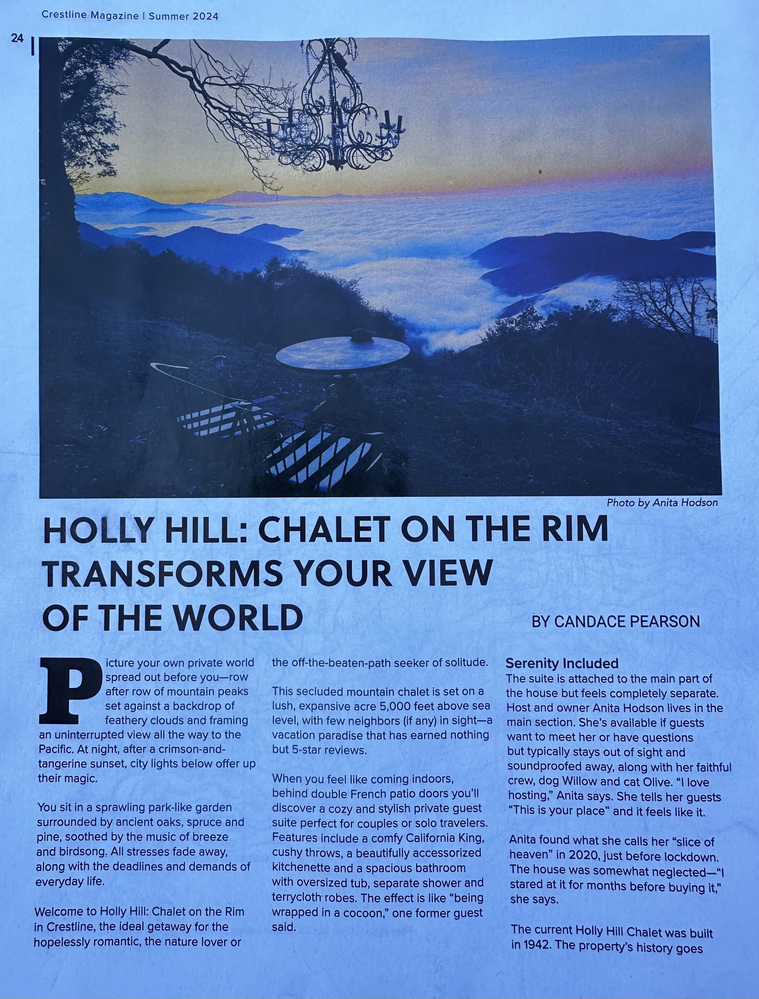 Magazine page featuring a scenic view of mountains and clouds from a chalet on Holly Hill, with a chandelier hanging above and outdoor furniture in the foreground.